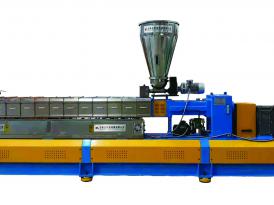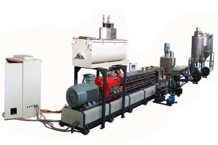 在加熱和混合的作用下,材料在擠出腔內形成高壓狀態,并通過模具的作用,將材料擠出成型,形成顆粒產品。主要組成部分包括驅動系統、傳動系統、加料系統、加熱冷卻系統、真空排氣系統、切粒系統等。